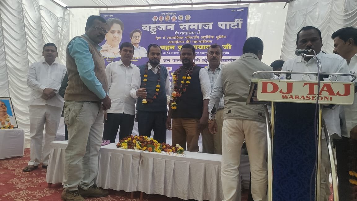 दिनदयाल चौक वारासिवनी में जिला बालाघाट के संगठन एवं पूर्व सांसद के मुख्य अतिथि के सान्निध्य में, बहुजन समाज पार्टी में शामिल हुए दिनेश पंचेश्वर जिनका स्वागत जिला संगठन के साथ-साथ पूर्व सांसद बुद्धसेन पटेल जी के द्वारा फुल – मालों के साथ किया गया एवं कार्यक्रम के मुख्य अतिथि पुर्व सांसद बुद्धसेन पटेल साहब ने बताया की हमें अपने देश और समाज के विकास के लिए वोटों के माध्यम से बहन मायावती जी को देश के प्रधानमंत्री की कुर्सी में काबिज़ करना होगा, तभी किसान मजदुर एवं गरीबों का विकास संभव हो सकता हैं l